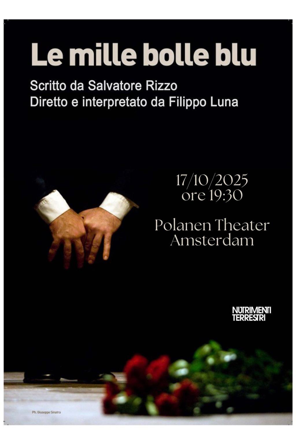Con grande gioia annunciamo che giovedì 17 ottobre al Teatro Polanen di Amsterdam andrà in scena lo spettacolo Le Mille Bolle Blu, con Filippo Luna, straordinario attore palermitano, da anni protagonista del teatro italiano.